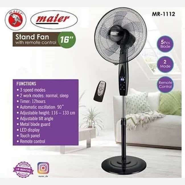 پنکه ایستاده مایر مدل 1112 دارای 3 سرعت دارای دو حالت عملکرد معمولی و خواب تایمر 12 ساعته چرخش اتومات 90درجه قابلیت تنظیم ارتفاع بین 116 تا 133 سانتی متردارای نمایشگر دیجیتال دارای پنل لمسی دارای کنترل از راه دور